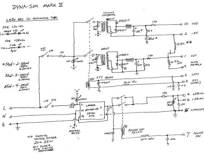 This is the latest version of the Dyna-Sim with the Lambda SWS600-24 Switching Power Supply that provides +27.5vdc at 25A. All changes for back emf unloading on the relay coils and additional decoupling capacitors are shown. Additional note,...I didn't use that 10A fuse ahead of the power on switches but the output fuse is 10A, not 15A. |
