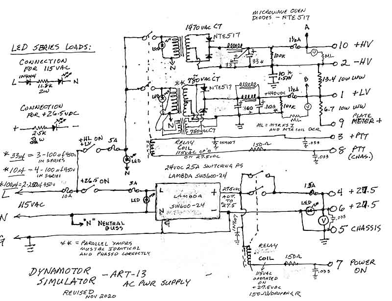 the +HV and I would shoot for about +1150vdc as the dynamotor supplied. The original dynamotor circuit provided +400vdc for the +LV and +750vdc (+HV) in series with the +LV to achieve +1150vdc plate voltage. A barometric pressure switch separated the two supplies above 25,000 feet altitude to prevent arc-over by reducing the plate voltage to +750vdc. It is very easy to use this same approach in designing an AC operated power supply, excluding the barometric pressure switch, of course. The advantages are that the components used will be rated at lower voltages which reduces expense and generally makes locating them easier. One thing to keep in mind is that the +LV supply must be able to handle not only its own current requirements but must also be able to carry the current required by the +HV since the negative return for the +HV is connected to the +LV and then to chassis. This means that the +LV will have to be capable of about 500mA maximum current. The original dynamotor spec for the +LV is 750mA but this is the dynamotor capability not the actual +LV current requirement of the ART-13. To handle the additional current the +LV transformers are actually two identical transformers that are connected in parallel. When operating transformers in this manner they must be exactly the same,... identical. Also, their connections must be "phased." This means that primary and the secondary windings must be connected so the AC applied and the AC output are in phase in each transformer. This is easy to test ahead of the building and mark the primary and secondary windings so there will be no confusion at assembly time. I only used the parallel transformers because I didn't have a single 400-0-400vac that had enough current capacity for the +LV (+LV and +HV current combined) requirement. If you can find a 500mA rated transformer then going with the single, although large, transformer is much easier. Same reason for the parallel chokes in the +LV supply. There are some changes that have to be made in the general design that allows for the proper operation of the Plate Current meter since the -HV is connected to +LV. This is basically done by providing a bridge circuit using a 13.4 ohm series load from -HV (negative meter connection) to pin 1 (+LV) and a 6.7 ohm series load from pin 1 (+LV) to pin 9 of U7 (positive meter connection.) This duplicates the circuit used in the original dynamotor. The advantage to this bridge resistor set up is that the Plate Current meter reads accurately regardless of the actual level of +HV and +LV as long as the ratio of +HV to +LV remains approximately 2:1 (actually, the ratio of +750 to +400 is 1.87:1 but the bridge resistor ratio is 2:1.) Since a minimum of +750vdc is used for +HV, the filter capacitors can be series-connected 100uf 450wvdc type electrolytics with 510K resistors across each cap to equalize the voltage drop across the series connections. Three capacitors are used resulting in a working voltage of about 1350vdc at a capacitance of about 33uf. Since we are using Pi-filtering, in an "unloaded" condition the +HV could soar to around +1035vdc.The extra "head-room" is protection in case the power supply is operated without a load. The same type of "head-room" is used in the +LV section, where the unloaded voltage could rise to around +600vdc. Using two series-connected 350wvdc electrolytics results in around +700vdc capability. In normal operation, the power supply design is such that the +HV and +LV are actuated with the PTT from the ART-13 which would also be in the powered-up condition thus presenting full load to both the +HV and +LV instantly. However, in some testing situations (or perhaps in an ART-13 failure mode) the power supply might be operated "lightly loaded" (or "unloaded") and this capacitor "hook-up" gives us the necessary head-room to survive this possibility without component damage to the power supply. Solid-state microwave oven type diodes can be used in both supplies connected as full-wave rectifiers. These diodes are type NTE517 rated at 15kv PIV. These diodes are relatively expensive at about $8.00 each. The advantage of SS diodes is higher output voltage from the power supplies. To take advantage of the smaller size and lighter weight possibilities, a 24vdc 13 amp Meanwell Switching Power Supply is used for the +28vdc requirements. This supply can be adjusted up to +27.0vdc maximum which will provide sufficient voltage to operate the filaments, relays and the Autotune. Though the Meanwell PS is RFI quite as a +27.0vdc source for the ART-13, it can cause interference in receivers unless the cable from the power supply to the ART-13 is fully shielded. NOTE: I used the Meanwell PS for several years without any serious problems. But, I noticed that when operating 630M with the receiver on a loop antenna, I could pick up some noise being generated by the Meanwell PS. HF didn't seem to pick up the noise, just MW. There were other issues with a switching spike on the transmitter output (not audible but seen on a 'scope.) Also, the Meanwell PS would "drop out" on initial power up causing the ART-13 to "chatter" for a few cycles before it would become stable. I eventually rebuilt the Dyna-Sim to use an external +28vdc 25A Lambda linear power supply to correct the problems that were caused by the Meanwell PS. 8-3-20. This power supply also had some issues in that it would "trip its breaker" when PTT was actuated or released. After a ten minute warm-up, the "tripping" was only an occasional nuisance. NOTE: Nov. 26, 2020 - I purchased a Lambda 24vdc 25A switching power supply. It's twice as wide as the Meanwell, slightly taller but about the same length. I've installed it onto the Dyna-Sim chassis where the Meanwell had been mounted. All wiring changes that were made for the external power supply were returned to original for internal connections to the new Lambda. A few different "vent holes" had to be cut into the cabinet since the Lambda fa