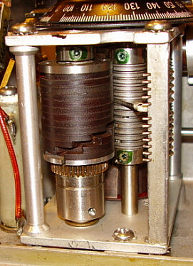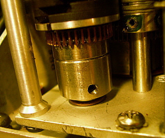 Channel Selector switch. Photo B: This is a close up of a single turn module showing the cam drum. This is where part of the pawl drops into when a channel is selected. Also, the front part of the pawl drops into the slot in the channel locking rings on the clutch drum which determines the preset. Photo C: This close up shows the cam drum collar which must be loosened and dropped down the shaft to disable the drive on an individual module for synchronization. The collar has a stop inside that couples a drive pin from the gear above. The drive pin couples to the collar stop and then, since the collar is set screw coupled to the cam drum shaft, turns it. |