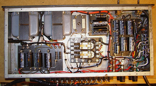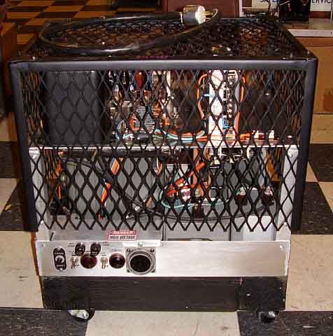 to the bottom and moving the unit around is actually quite easy. +1680vdc - Features a very large plate transformer that easily will handle 500mA continuous duty. This results in a very stable +HV for the transmitter. Solid State Microwave Oven diodes (NTE517) are used for rectifiers and two 2500wvdc rated oil filled capacitors in combination with two large chokes make up the Choke-input filter. A large 40K 100W bleeder resistor is used on the output. +400vdc - This supply uses a large power transformer rated at 200mA. Again, SS Microwave diodes are used (though not necessary) but this time a dual-section filter is used. This consists of three series combos of two 40uf electrolytic capacitors in series to get the working voltage up to 900vdc. 470K resistors are across each electrolytic to even out the voltage drop. +26.5vdc - This is provided by a Solid State commercial power supply rated at 13Amps. This modern switching power supply has a cooling fan that changes speed depending on the current demand. Manufactured by Meanwell. All output wires must be shielded for potential RFI problems. Relays - Two 28vdc relays provide "Power ON" function for the ART-13 and the Push-to-Talk function. Fuses - All inputs and outputs are fused for full protection. Meters - No meters are provided on the Brute Pilot Lamps - These are vintage 120vac lamps. Amber indicates that the +28vdc power supply is turned ON. When the ART-13 is switched ON a relay actuates and connects +28vdc to the ART-13 U-7 plug. The Red lamp indicates that AC primary voltage is routed to the PTT relay and that +LV and +HV will be routed to the ART-13 when PTT is actuated. Plate Current Meter Shunt - This is a large Ohmite 400 ohm 25W pot is in parallel with a 25 ohm 25W ww resistor. Can be adjusted to 20 ohms for a 1X meter scaling or set to 1.5X or 2X if desired. Cage - This large metal screened cover protects the user (or pets) from accidental contact with the +LV or +HV circuits. Since the "Brute" is designed to set on the floor, it is located far away from the ART-13 and no magnetic coupling issues are experienced.