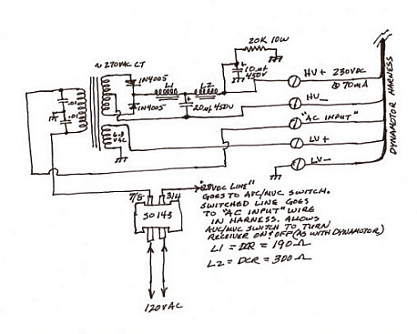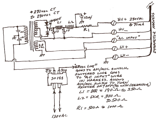 The Dynamotor harness was intact in SN 10662 so I utilized an original terminal strip from a "junk" DM-28 base. This was mounted under the chassis with spacers so it would place the terminal screws at the proper height for the opening in the side panel of the receiver to allow access for connecting and disconnecting the harness. AC (line - hot) is routed into the SO-143 connector via pins 3 and 4. AC line then goes through the wiring harness utilizing the AVC-MVC switch for "ON/OFF" function (as original) and then to the AC power supply via the dynamotor harness. This routing doesn't add any AC hum to the receiver output. I have tried both a direct AC connection to the power supply and routing through the harness - there is no difference, so no hum is "added" by using the AC connection as shown in the schematic. |