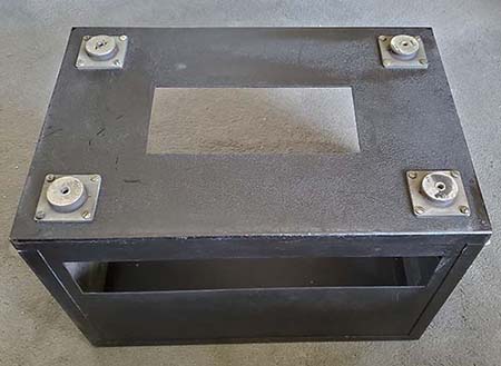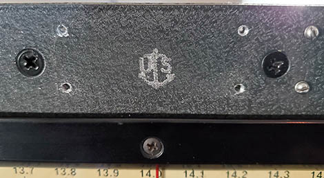 This close-up of the Collins Mfg. SN and the data plate area of the front panel shows that the original paint is still inside the data plate mounting holes. This area of the receiver is very important because it's obvious that a data plate has never been mounted here. Normally, when a data plate was installed, the wrinkle finish paint near the screw holes will be compressed. This results in the paint around the screw holes looking "glossy." So, observing that the paint is still in the screw holes and the wrinkle finish hasn't been compressed, no data plate has ever been mounted to SN:1999 which indicates the receiver wasn't a R-388 when it left Collins. |