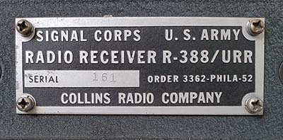 | Knobs and Tubes - Since this R-388 was a "basket case" it naturally didn't include all of the knobs or many of the tubes. Luckily, I had a complete set of Daka-Ware knobs that had come with the "parts set" 51J-2 receiver. I did have to search through the junk box to find a set of Daka-Ware kilocycle and megacycle skirted knobs since those weren't on the 51J-2 "parts set." Most of the tubes missing were the 6BA6 tubes. In fact, the R-388 uses seven 6BA6 tubes. Also, missing were the two 6AK5 tubes, the three 6BE6 tubes, the 6AQ5 and the 5V4 rectifier. All tubes were found in the tube "junk" boxes. All tubes used in the R-388 should test well above "minimum acceptable" for best performance. | Repro ID Tag - As can be seen, this receiver originally had two data plates installed that had been removed in the past. The center tag was the serial number identification plate and the tag to the right was a "Caution" tag that informed the user to refer to the TM manual. Luckily, there are a few repro tags available from Mike Chanter (Collins Radio Association.) He supplies a 1950, 1953-54 and 1957 type tags. Since this R-388 was probably built on a 1951 contract, I should have gotten the 1954 tag but instead I bought the 1950 version. The thinking was that the MFP date of "JAN 52" would have to be from an earlier build, thus the 1950 tag. However, knowing that Collins built R-388 receivers an put them into inventory for later contract sales, maybe the 1953-54 tag would have been a better choice. NOTE: THE original data plate was obtained, or was it?. |