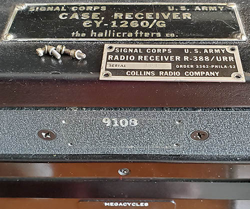 only have been done to a 51J-3 receiver, not to a R-388 receiver. Although these two observations are certainly noteworthy, I'm confident that the PTO is original to the receiver. I can't explain the "C.R." suffix but the installation is just "too good" to be anything but original (this is especially true of the PTO output cable-shield where it's soldered to chassis-grounding lugs - it's too good to be anything but original.) As far as the top cover goes, it's possible that the 51J-3