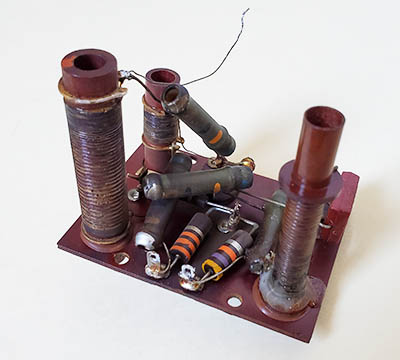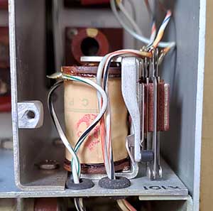 A thorough inspection did turn up this Anchor ink-stamp, probably USN approval for the component itself. It's logical that since the same relay was used in both R-388s and 51J-3s, all of the Break-in relays were stocked with one part number. When a receiver was assembled, the parts were pulled from stock and, since the stamp was the result of a component inspection and approval they would end up in either R-388s or 51J-3 receivers. |