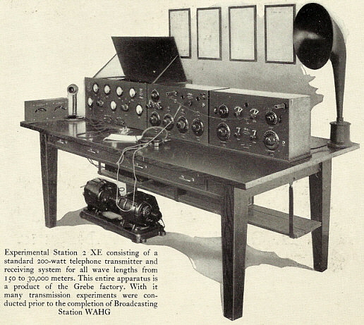 Grebe produced a series of ham receivers designated with a "CR" prefix followed by a number to identify the model. The CR receivers were very popular with the hams and, if a commercially built receiver is seen in a vintage photograph of an old ham station, it will more than likely be a Grebe "CR" receiver. The amateur business was large enough that, by 1920, Grebe had a fairly large building for radio manufacturing. The A. H. Grebe & Co., Inc. was incorporated in January, 1920. When Westinghouse started their commercial broadcasting station, KDKA, in November, 1920, the general public became aware that "RADIO" could be more than the dots and dashes of International Morse. Prior to professional commercial broadcasting, 99% of what was on the air was in International Morse. The general public's opinion was "why buy a radio, I don't know Morse." Broadcasting was beginning to develop through 1921 and by mid-1922, there were over one hundred licensed "commercial" broadcasting stations on the air. The Broadcast Boom created an insatiable market for radios,...any radios. Radio receivers that had previously been for radio amateurs were sold as broadcast receivers. Old radio companies like Kennedy, Adams-Morgan and others, that were primarily ham or experimenter builders, offered their radios as broadcast receivers.