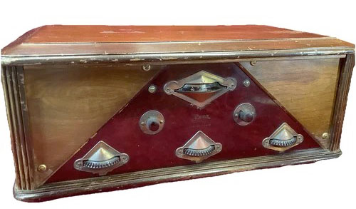 | The front panel is made out of bakelite with the front side faux wood grained to look like mahogany. Sometimes the faux pattern appears "mottled" to simulate burl grain and sometimes the grain pattern appears linear. This seems to be variations in the manufacturing of the panels because there is no consistency with both linear and mottled panels appearing throughout production of the Synchrophase. |