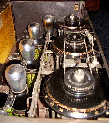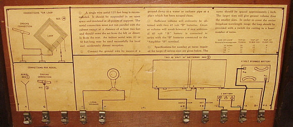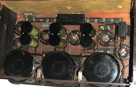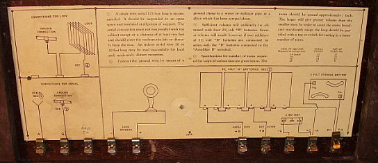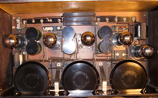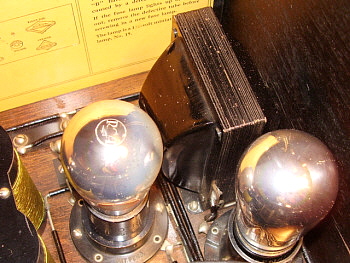 photo above: The new escutcheons required for the mid-1925 upgrades. Note that OFF has been added to the new VOLUME escutcheon. OFF was always provided with the old FILAMENT control as the "0" position but now, since it's a VOLUME control, OFF had to be spelled out. Note the mottled faux grain finish to the bakelite panel on this mid-production receiver. From MU-1 RJNA |