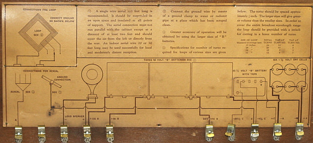photo above: The new Hook-up Card for the 1926 upgrades showing the three +45vdc B batteries, a Cone Speaker, new connections for +135vdc B+, new Ground connection location. Additionally, the Instruction Card was updated to reflect the 1926 changes. The new Instruction Card appears very similar to the 1925 upgrade cards with just minor changes. Some newer Hook-up and Instruction Cards were cream color stock with red lettering. Most though are as shown above. |