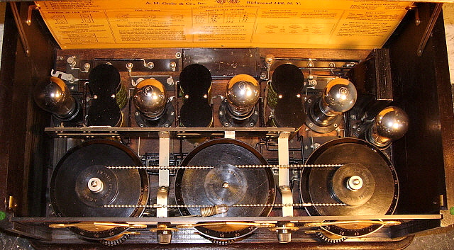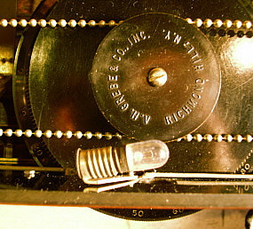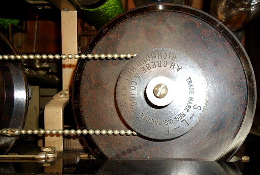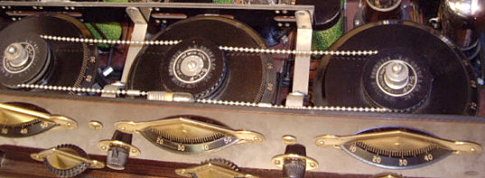 Single-Dial Tuning with Ball Chain Drive - With the increasing popularity of the Tuned Radio Frequency circuit, with its typical "three dial" tuning system, complaints regarding the difficulty of manipulating three different dials seemed to be the topic of extended discussions. Various mechanical coupling systems had been introduced as early as the Ther-mi-o-dyne radio's rack and pinion coupling system from 1924. The difficulty was in the precision necessary in the construction of the coils and of the tuning condensers. Each part had to be exactly built in order for mechanical tracking to be accomplished. The technology versus cost wasn't really available for the typical radio manufacturer at the time. Grebe came up with an easy mechanical coupling that, while allowing "single-dial tuning," also was very easy to change to an individual dial tuning for the user that wanted better accuracy. The use of the "ball-chain drive" was a solution that, while not very precise, did allow Grebe to advertise that the Synchrophase could now be tuned with a single dial (first advertised in August, 1925 but patent filed on May 13, 1925.) The system works from the central dial which has two drive sprockets mounted on top of the dial. From the central dial out to each of the other tuning dials a ball-chain is mounted to sprockets that are mounted on top of those dials. The central dial thus drives the two outer dials via the chains. If individual dial tuning is desired, the knurled nut on top of the outer dial sprockets can be loosened and then that sprocket will not turn that dial. The user could also use the knurled nuts to disengage the outer dials, then precisely tune in a station and then tighten the knurled nuts and the receiver was then "calibrated." Additionally, there was always a bit of play in the chain coupling anyway, so minute adjustments could be made for precise tuning. Though the ball-chain drive does pre-date the next upgrade, not many (if any) Synchrophase receivers were built with the ball chain drive but without the Low Wave Extension Circuit. |