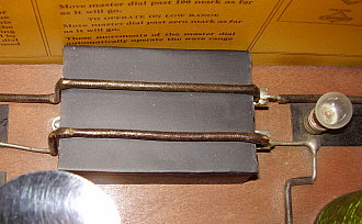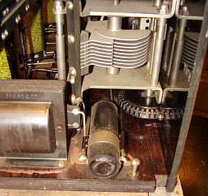 ![]() photo above: To create a TONE COLOR control from the old VOLUME control this series capacitor was added. It is mounted under the 1st RF Amplifier tuning condenser. |