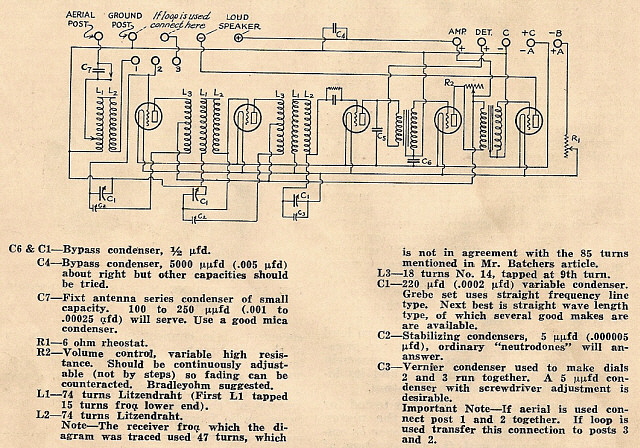 much for the legal story. Now, on to the circuit innovations. As stated in an April 1925 QST article by Ralph Batcher, one of the Grebe designers, it wasn't so much the circuit as it was the unique, precision components that made the Synchrophase such a great performing receiver. First were the "Binocular Coils." These were wound with Litz wire and then the RF impedance was checked to make sure all the wires of the Litz cable were correctly soldered. DC resistance checking would not show complete connections. The dual coils were connected to cancel the field and prevent coupling. Also, the primary was wound with very fine gauge wire (~40ga.) that allowed more turns and the primary was mounted inside the secondary to allow the field to act as a shield. The binocular coils provided the intra-stage isolation needed for the Neutrodyne RF stages to function without adding stray coupling to the RF amplifiers. The Binocular Coils were designed by P. D. Lowell. The tuning condensers were very small due to the high inductance value of the binocular coils. In 1924, the Grebe tuning condensers were the smallest value found in production radios. Additionally, the cut of the plates allowed for a Straight-Line-Frequency change per the inductance used in the tuned circuit. This was found experimentally in the Grebe labs and resulted in a sort of square looking plates on the condensers. The end result was even spacing of the stations across the tuning range. The S-L-F condensers were designed by Ralph Batcher. Most battery sets of 1924 controlled their output level by increasing or decreasing the tube filament voltage. More sophisticated radios might split the function to have many filament controls so the circuit could be adjusted for every signal type. Grebe decided that the filaments could be set at some reasonable level and the actual volume of the audio controlled in another manner. The Synchrophase uses a variable resistive shunt across the primary of the second audio interstage transformer to act as a volume control.
