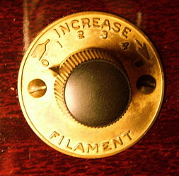 The very earliest Synchrophase receivers had small round escutcheons for both the Filament and the Volume controls. These early escutcheons are marked only with "INCREASE" and an arrow. The Instruction Card under the lid let the users know that the right hand control was the FILAMENT adjust and the left hand control was VOLUME. In fact, the Instruction Card shows the escutcheons with just INCREASE on them. |