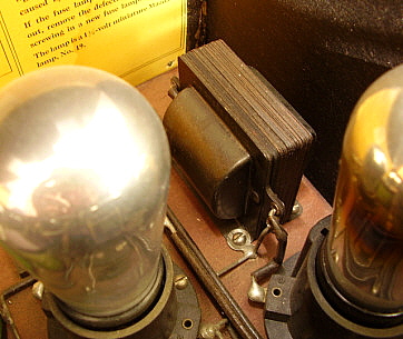 | In order to improve the bass response, Grebe first determined where the limitations were in the Synchrophase circuit. The first limitation was the audio interstage transformer coupling that was used to couple the audio signal through the two stages of amplification. Transformer coupling had the advantages of adding gain to the circuit but the disadvantage of requiring high quality construction to have good frequency response. Grebe found that the bass response could be enhanced in the first audio amplifier by using a much larger audio interstage transformer. By retaining the smaller interstage transformer for the second stage the higher frequencies were still present and since the bass had been enhanced in the previous stage, the overall frequency response of the two stages reproduced bass better. Grebe pointed out that now both stages had to be used together and a user couldn't pull the audio from just the first stage. Why this was mentioned is puzzling since the Synchrophase always used both stages of audio amplification and there was no earphone or single stage audio provisions. Maybe he was just making the point that both stages worked together. |