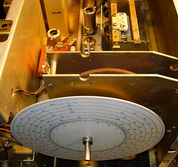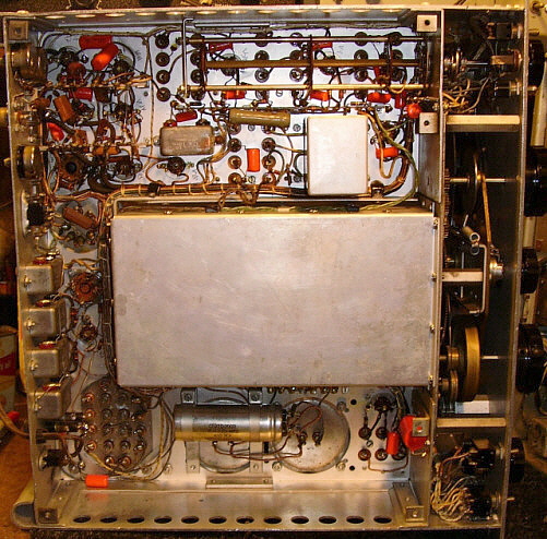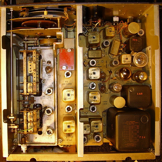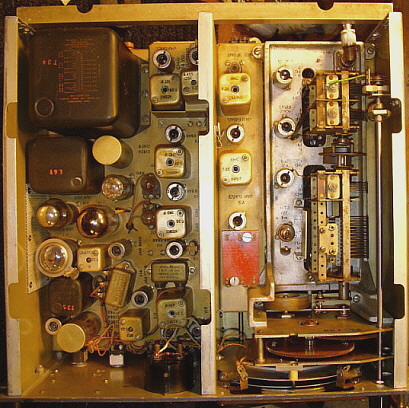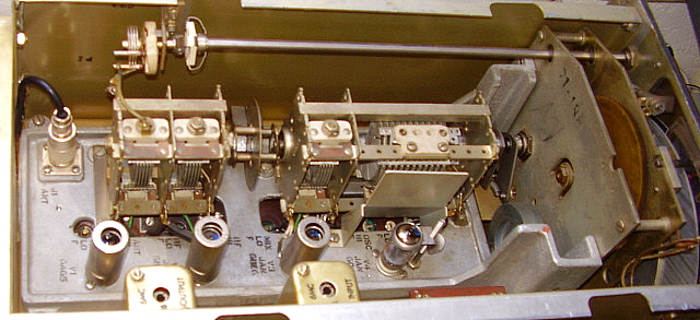 | Tuning Gear Boxes and Tuning Condenser Bearings - If you have to work on the gear box, the R-274 gear box is very easy to remove and work on. The SP-600 is a major job to remove but it is so robustly built, it is seldom necessary to do anything other than a general clean and lube. The R-274 gear box is prone to have wear in the concentric shafts that drive the main tuning dial and the logging scale. This wear ends up causing an erratic "jittering" movement of the main tuning dial. Cleaning and lubrication will help smooth the operation. The SP-600 dial drive often will exhibit some slippage. This is almost always due to spring fatigue on the "S" spring that applies the force for the drive wheel against the logging dial rim. The R-274 tuning condenser has bearings that require constant lubrication, even the TM mentions this. If lubrication is not sufficient, the tuning condenser rotor will "stick" and then extend the spring couplers on the bell-crank which then forces the rotor to jump to a new position. Sometimes the tuning will actually "reverse tune" when the knob is released. Needless to say, this makes tuning in any signals problematic. | R-274 Tuning Condenser Bearing Fix - I encountered this sticking problem on the first R-274 I owned. This receiver is now owned by KØDWC who reports that after this "fix" the tuning condenser is not sticking and the tuning is reliable. Unless you have severe sticking, don't bother with this fix. You can probably cure minor sticking with multiple lubrications and working the grease/oil mix into the bearings. For severe sticking,...read on. The only way to fix the tuning condenser bearing problem is to remove both of the condensers from the receiver and modify the bearings for better lubrication. The problem comes from the larger condenser use of two sealed ball bearings to support the rotor and the smaller condenser use of a sealed ball bearing in the front and a thrust ball bearing in the rear. These bearings were manufactured using steel with no protection from corrosion and, consequently, if the receiver is in a humid environment for several decades, these bearings will rust. Apparently the rust is able to work its way inside the sealed bearing. Since the bearing seems to be incapable of remaining sealed, it leaks out its lubricant over time and then the rust sets in causing roughness in rotation and eventually grabbing and sticking. To fix this problem, first remove the two tuning condensers. This can be accomplished from the top of the chassis with only removing the top and rear panels. When the condensers are out of the receiver, drill two small 3/32" holes in the metal seal between all three of the ball bearings. This allows easy application of a spray tube (the little red pipette) from a can of WD-40. Flush out the bearing until the WD-40 runs out clean. Next, I use a fairly light-weight, modern grease and work this grease into each of the bearings through the two access holes. Stop working the grease into the bearing when you see it coming out around the shaft at the rear of the bearing. Now, pack some more grease to seal the holes and remount the bearing cover. This fix seems to have lasted for quite a long time and is about as close as you can come to installing new bearings, which by the way, is literally impossible without destroying the tuning condenser. Use the procedure shown in TM11-897 to remove and reinstall the tuning condensers. |