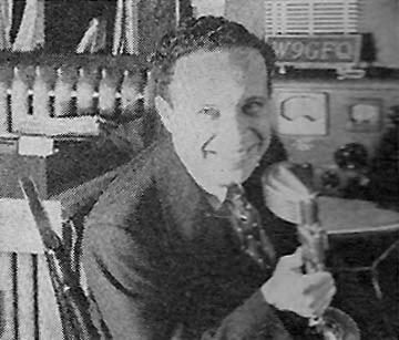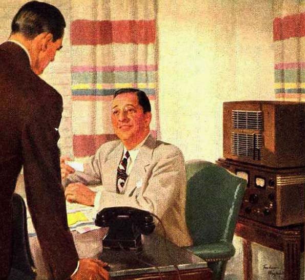 material turns reddish-brown to dark brown (in severe cases.) The next "White Dial" myth is that Hallicrafters supplied white dials on some SX-28s during WWII. This is highly unlikely and so far all evidence produced to support the use of "white dials" has been hearsay. If genuine WWII-vintage white dials for the SX-28 existed they were an anomaly that could have been the result of OEM parts shortages causing the military to use non-OEM parts during an echelon rebuild of an SX-28. An unlikely scenario. Who would have made the white non-OEM dials? The Signal Corps? The known evidence - an apparent absence of any authentic examples - leads one to conclude that the use of vintage white dials on an SX-28 is a myth. B&W Photographs versus Color Artwork - I've never seen a 1940 to 1946 color photograph of a then "new" SX-28 or SX-28A. Every photo is black and white. That's to be expected since color photography was fairly expensive then. The black and white photos show the light yellow dials as appearing white or, at least, some very light color that could be assumed to be white. I've only seen one 1940s color rendition of the SX-28. It was the artwork shown to the right for a Hallicrafters advertisement that showed Bill Halligan in his office with a SX-28/PM-23 behind him. The dial color is vague in the artwork since the SX-28 is in the background. But, it does appear to be very light yellow (maybe illuminated dials?) As a reference, look at the card that Halligan is holding in his right hand for the artist's depiction of something white. At any rate, it's artwork and not a photograph. After all, look at where the "h" is on the PM-23 and its exaggerated size. The true test would be to disassemble a main tuning dial and remove the hub. The color of the plastic shouldn't have darkened since it has been covered by the hub flange. |