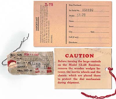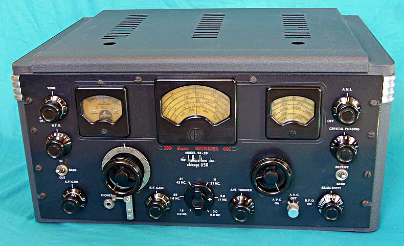 of WWII. Post-WWII saw the civilian ham market open up almost immediately with most dealers offering the SX-28A as available by September 1945. The receivers produced from September to approximately October 1945 are identified as "SX-28" on the front panel. From sometime in October 1945 up to June 1946, the receiver has "SX-28A" on the front panel. About 4000 SX-28A receivers were produced with the "SX-28A" identification on the front panel. Hallicrafters advertised in early 1946 that they had built 50,000 SX-28 and SX-28A receivers but this seems to be exaggerated advertising hyperbole. Based on reported serial numbers, the estimated production is about 17,000 SX-28 receivers and about 11,000 SX-28A receivers for a total of 28,000 receivers. It appears that all SX-28 and SX-28A receivers had a Hallicrafters data plate installed on the rear chassis with the serial number stamped into the tag. Only the aircraft receiver R-45/ARR-7 is serialized using a different format but its production probably only accounts for about 1500 receivers (and it's really not a SX-28A anyway.) With the SX-28 introduction, the selling price was $159. The post-WWII price had escalated to $223. The SX-28 replacement receiver was the SX-42, introduced in August 1946. Although it was Hallicrafters' new "flagship" receiver, it didn't look anything like the old SX-28, and its standard HF circuit design additionally offered the buyer FM coverage from 27mc up to 108mc. The SX-42 never achieved the customer enthusiasm or the devoted following that the old SX-28 had. The SX-42 didn't survive very long as Hallicrafters' flagship either, with its production only going until mid-1947. |