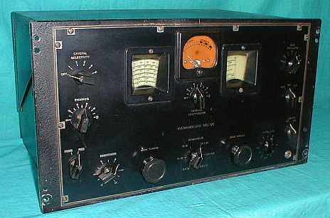 HQ-120X - Hammarlund realized that the Super-Pro was far too expensive for the majority of hams and that it was really a commercial-professional receiver that wasn't specifically for the ham market. So, Hammarlund designed and built a receiver that was intended just for the ham market, the 12 tube, HQ-120X, (introduced in Oct. 1938.) To keep the selling price within the typical late-thirties ham's budget, the circuit uses a converter tube, single pre-selection, single-ended audio with 6 ohms output Z and a built-in power supply with voltage regulator tube. The frequency coverage was .54 to 31MC and ham band calibration was provided on the bandspread dial (generally credited as the first ham band calibrated bandspread available.) Selling price listed at $230 but the receiver usually sold for around $190 (usually much less) from most dealers. The HQ-120X was popular and provided decent performance on shortwave and ham bands up to about 18 Mc. Beyond that, images and lack of sensitivity become a problem (that would be on just the highest frequency band of the receiver - 18mc to 31mc.) Late in production, a special gray painted version was offered. HQ-120X Circuit - Single conversion, single preselection superheterodyne tuning from .54 to 30mc in six tuning ranges. Tubes used are: RF-6S7, Conv-6K8, IF1-6S7, IF2-6S7, 1-6F6, Det/AVC-6H6, NL-6H6, BFO-6J7, S-Mtr Amp-6SF5, Audio Out - 6V6, VR-VR-150, Rect-5Z4. Shown in the photo to the left is an unusual rack mount version of the HQ-120X. It has a special extended front panel and features side gussets with a full dust cover. |