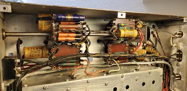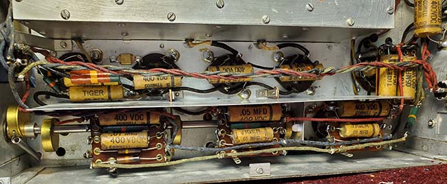 use. That leaves 18 pw caps left in the chassis to do. My procedure nowadays is to make a simple drawing of the of the underside of the chassis showing the pw caps, their value and the location of the outside wrap band. With the drawing as a reference, I can remove a fairly large number of caps, rebuild them and then reinstall. Since there are 18 left, I'll probably do two sessions and remove nine caps for each rebuilding session. As a reference for time involved, it took one and half hours to rebuild the eight pw caps that I did earlier. This time didn't account for capacitor removal or reinstallation. Those tasks would have increased the time involved to probably two hours. Photo right shows the rebuilt capacitors in the RF/IF section of the chassis. |