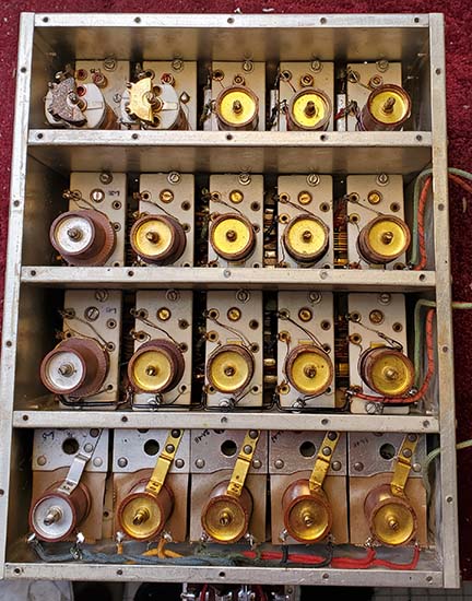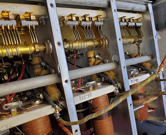 coverage. The RF/Coil box has to be removed from the receiver chassis to allow side panel removal which will allow better access to install the replacement coil assemblies. Also, there are five paper-wax capacitors inside the box that will need rebuilding. Also, the four grid leads need to be restored. All of the grid leads on the IFs, Amplified AVC, Crystal Filter all need to be replaced due to drying out of the natural rubber insulation that is now "falling off" with the slightest provocation. April 9, 2019 - Dismounting RF/Coil Box - Only a few wires need to be unsoldered under the chassis. There are obvious screws to remove but there are two hidden screws that are inside the back Antenna Input housing. The two small shields have to be removed to access these two inner screws. The RF/Coil Box can then be lifted off of the chassis. There are 25 screws on each side panel and both sides have to be removed. One side to access the area for the 100kc to 200kc coil work and the other side to access the five paper-wax capacitors. It's better to remove the two dials since they aren't protected when the RF/Coil Box is out of the receiver. Additionally, the four grid leads need to be replaced and the connections aren't accessible unless that side panel is off. April 11. 2019 - Installing the BC-779 Coils - The BC-779 coils arrived today. Other than minor finishing, they are identical to the coils in the SP-100LX. Even the same identification number is used for the isolantite bases. The obvious change is the cadmium plating used on the metal parts where the SP-100LX coil metal parts are brass. I installed L5/L10. I had to make an extension for the L10 secondary connection since the original wire had been cut. But, the twisted pair from the Antenna terminals switch to L5 could be routed exactly as original. The BC-779 coils do have wire ends left on since they were "cut" when the coils were extracted. This helps in using the correct routing and the correct connections. April 12, 2019 - RF Box Restoration - Completed the installation of all 100kc to 200kc coils (L5/L10, L15, L20 & L25) into the RF Box. Two wires needed extensions. I salvaged the correct color cloth insulation to cover the extensions. The four grid leads were restored using cream-color rubber insulation salvaged from old AC line cable. The proper stranded wire was inserted into the proper length rubber insulation to create original looking grid leads. These were installed into the RF Box. The plate leads to the 1RF and 2RF tubes were too short. Bare wire extensions had been in the receiver that connected pin 3 of the 6K7 tubes to the wires from the RF box. I plan on using the same connections but covering the bare wire with vintage black vinyl sleeving. April 13, 2019 - New Grid Leads - Finished the installation of new rubber insulated grid leads by installing new grommets for the feed-thru holes and installing the original grid caps. New grommets were installed for the Plate leads and the LO cathode lead. Installed the side panel and the mounting bracket. This completed the tuning condenser side of the RF Box. |