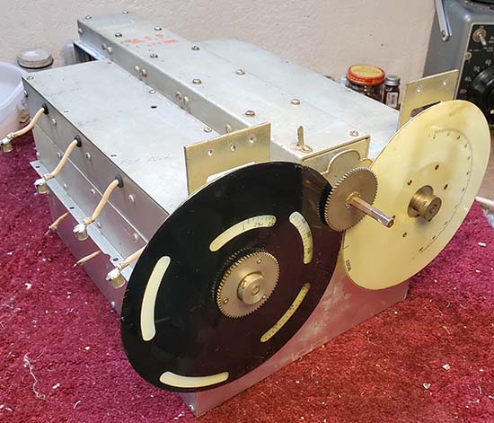 missing than just L5/L10. Update Apr 3, 2019 - Trading Parts - A routine e-mail from W6SSP reporting a serial number for a SX-28 receiver had a surprising turn when I mentioned in a reply e-mail that I was looking for a "junk" BC-779. It turned out Steve had the RF box for a BC-779 available for "parts removal." This meant that I had to specify what I needed and he would remove the required part. I ended up trading SX-28 T-2, (2) T-3 and a '28 tuning condenser box cover for BC-779 coils L5/L10. Update Apr 4, 2019 - Getting Started (Finally) - In anticipation of actually obtaining a replacement L5/L10 for this receiver, I performed another "closer look" inspection and found that not only was the 100kc to 200kc Antenna/RF coil (L5/L10) missing but the remaining three coils (L15, L20 and L25) weren't original. They weren't even close in appearance to originals. It looks like someone in the past removed all of the 100kc to 200kc coils and installed other types of coils in the LO, Mixer and 2RF positions in an attempt to have the 100kc to 200kc band tune the AM BC band instead. The ceramic bases are present for the LO, Mixer and 2RF with different coils mounted using small brackets. Luckily, W6SSP could also supply L15, L20 and L25 (I offered to add a SX-28 AVC knob to the return trade list.) The rest of the receiver is relatively stock. Only three resistors changed and eight capacitors changed. Also, missing is the stock RELAY pin jack terminal fiber block on the rear of the chassis. Unfortunately, the SP-200 series changed this part to a screw terminal block that is physically much larger. April 8, 2019 - Disassembling the Receiver - Removed top and bottom covers, removed coil box cover, removed all tubes, dismounted the meter, the crystal filter assembly (requires desoldering two wires,) all knobs, front panel, dial index assemblies, mask drive gear and the dial escutcheons. All parts were put into plastic bags and then placed in a large plastic bin for safe storage. RF BOX REWORK - Photo to the right shows the LX coil box before any restoration work was performed. The coils on the left side of the box should be the 100kc to 200kc set of coils. It can be seen that the Antenna coil set (bottom row) is entirely missing. The RF and Mixer coils are oddball replacements with internal brass slug. The Oscillator coil is small and has a compression trimmer associated with it. All of these coils are mounted on the original isolantite coil bases using small brackets. Note that the twisted lead from the Antenna terminals has extension wires added to route the antenna input to the RF coil and no Antenna coil is used (typical use of white medical tape for insulation.) Judging by the size of the coils it appears that this modification was to change the 100kc to 200kc coverage to the AM BC band (540kc to 1700kc.) |