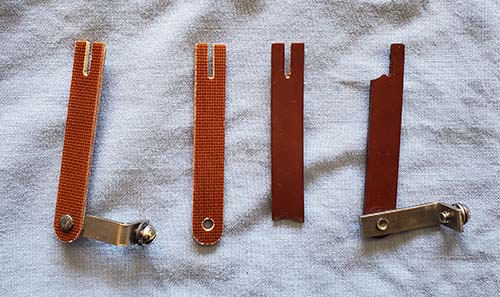 The Variable Coupled IF fiber board cam levers that actuate the IF plungers were warped. One was already broken and I broke the other one trying to mount it so it would ride on the cam correctly. These are easy to make since they are just .060" thick fiberboard material. The originals were riveted to the mount but if I can't save and reuse the rivets, I'll have to use a screw and nut to replace the rivet. Unfortunately, I've robbed these parts out of my Super Pro "parts set" a long time ago. I'll have to make these fiberboard pieces. Apr 27, 2019 - Vari-Cpl'd IF Levers - I measured the thickness of the levers at 1/16" or .063" and the material is actually garolite which is a woven cloth that's impregnated with resin and is typically brown in color. Everything I had in the "junk boxes" was too thick. Since the slotted-end of the lever has to fit in the slot of the IF transformer plunger, the thickness is important. I ordered four 12"x12" sheets of .063" garolite off of eBay. I'll have plenty to make lots of mistakes in building these levers. Photo left shows the rebuilt capacitors in the AF/AVC section of the chassis. |