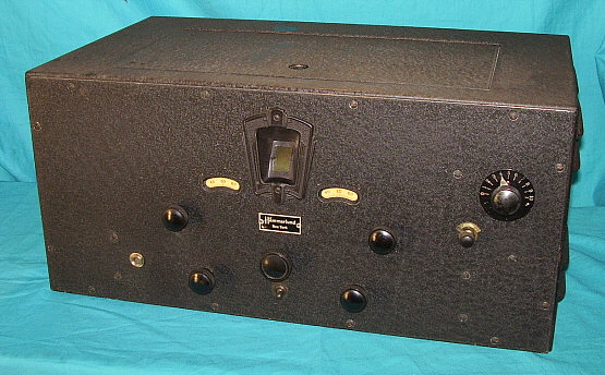 photo: The 1933 Hammarlund Comet Pro with Crystal Filter option but without the AVC option. Images are not a problem with the coil sets DD, CC or BB but the highest frequency coil set AA (10MC to 20MC) is plagued with images. This isn't unexpected in a receiver without a TRF amplifier ahead of the mixer tuning above 10MC. With the AA set, it is best to use the graphs to set the desired frequency since the images are about the same strength as the tuned signal. The addition of an aftermarket pre-selector would all but eliminate the image problem on the AA range (see last photo in this section.) Drift is rapid for the first 10 minutes of operation, then settles down to a very slow drift that is standard for pre-war receivers. For a 1933 receiver, the Comet Pro is a fine performer and it would certainly be possible to use it for vintage ham communications today although earlier versions do not have a "stand-by" function. |