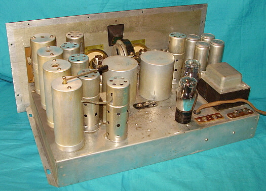 very early SP-200. Unfortunately, the 100 Series power supply was in deplorable condition with the front panel having been painted "sparkle gray" and also a lot of .25" holes drilled in the cabinet over the 5Z3 rectifier tube. Inside, none of the filter capacitors were original and one filter cap on the bias supply was missing altogether. I looked thru my stock of old style can electrolytics to see if I could find three 16uf cans that matched,...no luck. I looked thru more junk boxes to see if I could find a box-type cardboard housing for the three 8uf caps,...again, nothing. I decided to install a vintage component board under the chassis and mount new filter caps there. If, in the future, I do find three matching vintage cans or a vintage cardboard cap housing, I can replace the component board and install the new caps inside these cans and the box. |