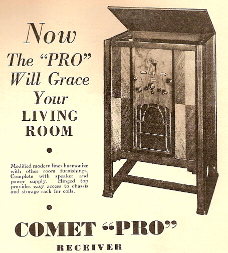 Comet Pro Selling Prices The Comet Pro list price was $150 without tubes. However, it was usually offered in several different configurations. Generally, prices were as follows: A. Comet Pro Standard Chassis.......$79.38 With all options the price was usually around $140 in 1934. However, Leeds did offer a complete Comet-Pro for the total price of $117 FOB, in 1934. The 1934 competition's asking prices were as follows: Patterson PR-10............. $70.00 - speaker included