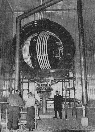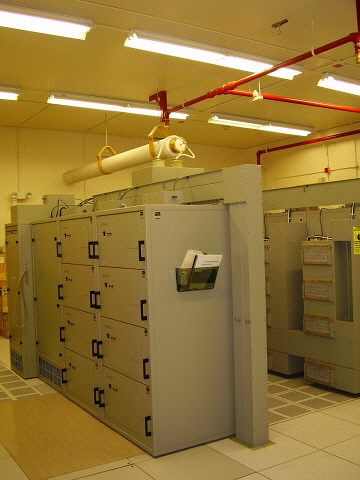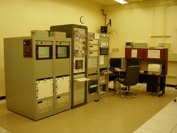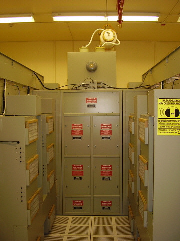 Left: The Loran C 400 KW transmitter built by Megapulse. Most of the transmitter consists of sixteen drivers (eight panels on each side) that shape the final output signal. The station can operate with up to two drivers not working. Past the drivers is the output stage followed by the output coupler. The output coupler attaches to the feedline via two large cables (this 8" PVC feedline exits the transmitter building wall and goes directly to the antenna.) The incredibly large switching load on the transmitter power supplies results in a very loud audible representation of the transmitted signal. The two huge power supplies are set up against the two walls of the transmitter building across the isles from each of the transmitter's two sets of driver panel cabinets.