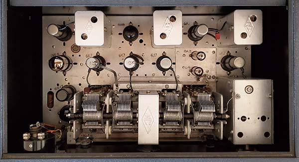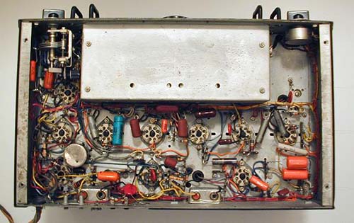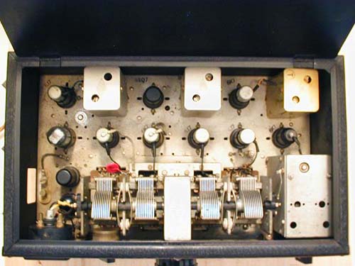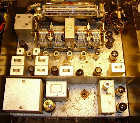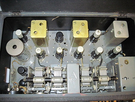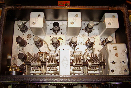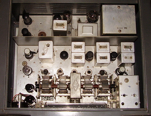 photo above: The HRO-60C (R) chassis with the dust cover removed. The smaller IF transformers are for the first conversion set-up. Note the two dual IF transformers - the HRO-50-1 used three dual IF transformers. The rear of the chassis has the Calibration Oscillator installed but a NBFM module is not installed (a useless device anyway.) This HRO-60C had spent many years in a basement in New York City. The chassis "spots" are a result of the somewhat humid environment reacting with the cadmium plating used on the chassis. |
