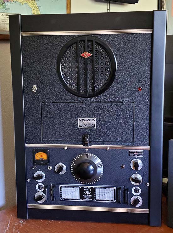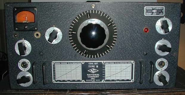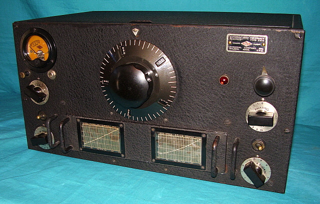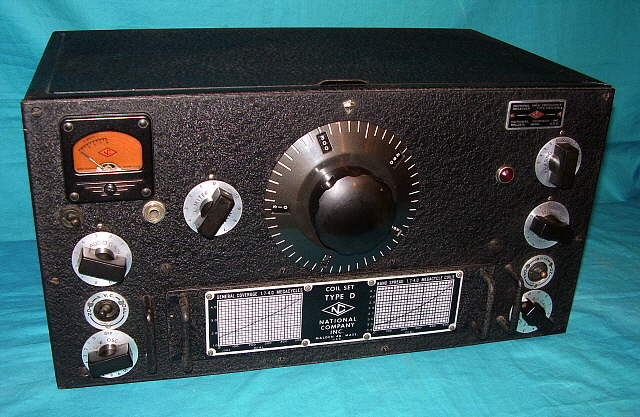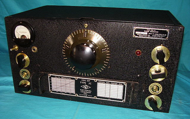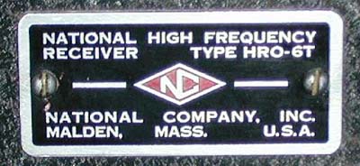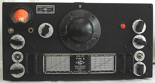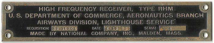 By the early thirties, National had grown from a company that had been producing radio parts and regenerative TRF receivers into one of the top shortwave receiver producers in the country. National's chief engineer and general manager, James Millen, had guided the company from its early radio designs (that usually had National as a parts supplier) into the new shortwave receiver market that was becoming popular by 1930. The RHM Receiver - In late-1931, National Company was selected by the Department of Commerce (who was in charge of airports and airways through the Aeronautical Branch) to build new superheterodyne receivers to replace the old regenerative receivers then being used at airports around the country. The entire system upgrade of airport-airway communication and air navigation equipment included General Electric, who got the contract for the new Range Beacon and ground communications transmitters and Aircraft Radio Corporation, who got the contract for the new airborne gear. National got the contract for the ground-based airport and Radio Range communications receivers. It seems likely that Herbert Hoover Jr. and his West Coast design team were involved in some of the electronic engineering work of the new receiver that was designated RHM. National was the primary mechanical designer and the builder of the RHM receivers. The contact was identified as 32-15305 and was dated May 12, 1932. The RHM was National's first superhet and it had some of the features that were to become National's trade-mark. Plug-in coils to select the tuning ranges, a separate power supply and a micrometer-type tuning dial are foremost in the design and were to become standard features for National receivers over the next several years. Since the RHM was a commercial airport receiver it had to be built with the best material and best parts available to assure top reliability and performance. Each receiver was hand tested and aligned by engineers at National resulting in a very modern receiver that provided excellent sensitivity and selectivity (along with top-notch image rejection due to its TRF amplifier stage.) Frequency coverage of the RHM was 2.3mc up to 15.0mc using a set of 15 coils. Each band required three coils, RF Amp, Mixer and Local Oscillator providing the user with five tuning ranges. The IF was erroneously shown as 600kc in all of the initially supplied operating instructions. The actual IF is 500kc.*. It's estimated that only around 100 RHM receivers were built and just a few survive today since most of the airport equipment was scrapped when it became obsolete. photo right: 1932 RHM Receiver - no serial number, repro data plate |