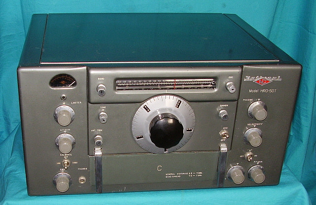 The HRO-50 and HRO 50-1 - The new HRO-50 was going to bring the HRO design into the mid-twentieth century. No more separate power supply that was cable connected to the receiver. The separate power supply was certainly the first on the list of things that needed to go. The new HRO power supply was built-in though on a separate chassis that was bolted behind the main receiver chassis and thermally insulated from the receiver chassis by an asbestos sheet that was also continued up to the top of the vertical divider panel to provide insulation from the heat from the rectifier tube and the audio tubes. Relying on the micrometer dial versus graphs was also gone. Now an illuminated linear slide-rule dial would provide direct frequency readout. Changeable plastic scales were mounted to a front panel controlled, rotating drum, providing band-in-use scaling. The PW-D dial was now just for logging purposes. An Antenna Trim control on the front panel was finally incorporated. Auxiliary sockets were provided for the optional 1MC/100KC crystal calibrator and NBFM adaptor. Also, a Local Oscillator Trim that allowed front panel calibration for the best dial accuracy (using the crystal calibrator - either the optional one or an external calibrator.) A voltage regulator, push-pull audio, 8Z ohm and 500Z ohm audio outputs (audio output transformer in the receiver) - almost everything necessary to update the old HRO. The plug-in coils had to remain, but at least the switching from GC to BS was easily accomplished with small switches on the coil assemblies (no more moving those four little screws.) Of course, the PW-D micrometer dial had to be included otherwise it wouldn't even have been an HRO (it was certainly the most elaborate logging scale ever included on a receiver.) The HRO-50 was introduced in 1950 and was followed quickly by the HRO-50-1 that added an extra IF amplifier and, to improve selectivity, double IF transformers were used in last two IF stages (three dual transformers that included a dual IF output transformer to the detector tube.) With 12 tuned IF transformers, the receiver was very selective. The HRO-50-1 was produced in 1951 through 1952. Early versions of the HRO-50 had grey grip knobs with bright aluminum skirts. Even the PW-D used the gray HRT-style knob on the earliest versions. Later versions will have gray knobs and the PW-D will have the standard HRK-style black knob. All HRO-50-1 versions have all black knobs. If the receiver is a table cabinet it will be labeled as "HRO-50T" or "HRO-50T-1." Rack mounts substituted an "R" for the "T" and are so-marked. |