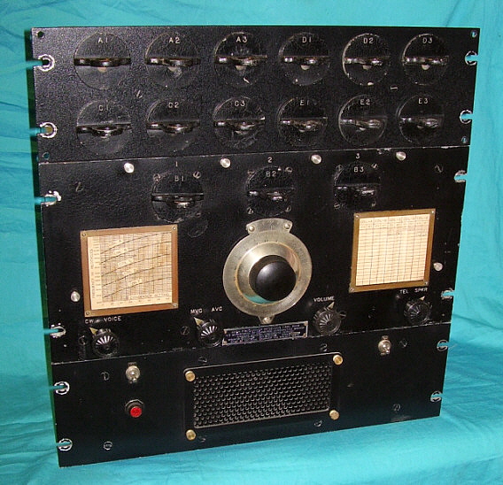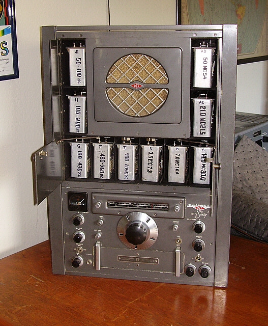 to the right. Accessories - Although I haven't found any National Company literature that mentions a HRO-7T in Black Wrinkle, the associated accessories must have also been painted to match. The standard supplied D, C, B and A coil panels would have been black wrinkle (or use HRO-7R coil sets, serialized and aligned to the specific receiver,) the 697 power supply should have also been black wrinkle (that was the standard color when the 697 was supplied with the HRO-5TA1) and the MCR loudspeaker would have been black wrinkle (if the end user required a loudspeaker.) Perhaps the special order included the "complete set of accessories" which all would have been provided in black wrinkle. |