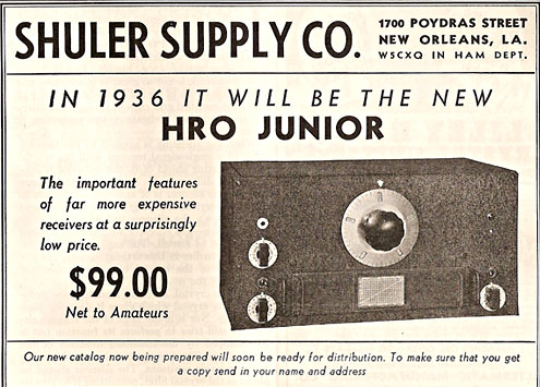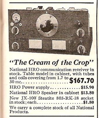 | Without a doubt the finest creation to come from National Company, Inc. was their HRO Communications Receiver. Introduced in October 1934 (first production run January 1935 with first deliveries in March 1935,) the HRO featured incredible performance capabilities coupled with an anachronistic, almost scientific instrument appearance that certainly appealed to the technically-minded ham. The host of accessories necessary for complete operation included a power supply, a speaker and four plug-in coil sets. The HRO main tuning dial was unlike any other - a non-illuminated micrometer device that displayed numbers behind small openings as the dial was rotated. Each of the coil sets had graphs that could be correlated to the micrometer readout to determine tuned frequency. Much of the HRO's engineering seemed to contradict everything that was happening with contemporary receiver design. Why did a receiver that seemed to defy then-modern communications receiver evolution become such a favorite of hams, the military and commercial users? By providing absolutely the best low noise front-end resulting in high sensitivity coupled with an incredibly well-designed tuning system along with tremendous bandspread capability, giving the user the ultimate advantage when it came to working rare DX or coping with challenging band conditions. - H. Rogers, April 2007 |