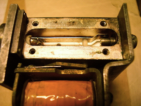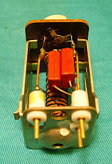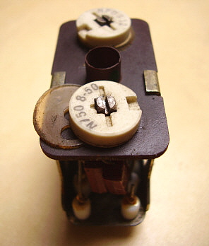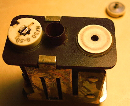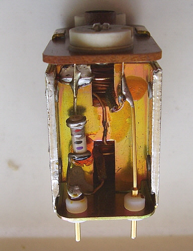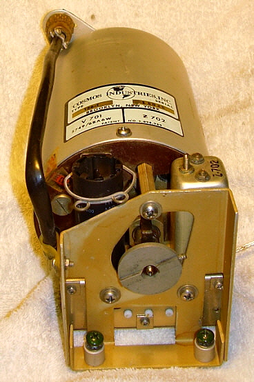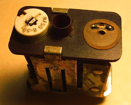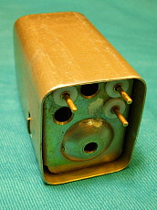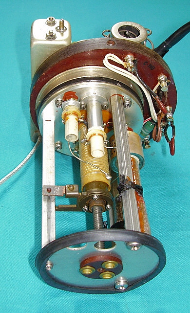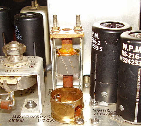 With the PTO out of the receiver first remove the mounting bracket on the rear of the can. Next, remove the three screws at the front of the can (removing the rear mounting bracket also removed the two rear can screws.) Slide the can cover off. Now, you'll see a fiberglass-wrapped can shield. This is the PTO oven. Some PTOs have the fiberglass wrapped with cord to secure it. Others had the fiberglass wrapped upon itself to have it stay in place. It's not necessary to remove the fiberglass. You'll have to unsolder the two wires to the oven element. It's also necessary to unsolder the other two wires to the oven thermostat. Then remove the three mounting screws at the front of the oven-can and slide the oven off. Now there's one more shield-can to remove. By removing the oven mounting screws, now this last shield is only held in place by the two O-ring gaskets inside. It's a tight fit but by twisting the can and pulling, it will come off. This then reveals the inside of the PTO. Once inside, you'll see that L-701 is actually two inductors connected in series. The larger one is for adjusting the EPE. You'll also see the threaded rear mount assembly for the ferrite core. There are three screws that slightly change the exit position of the threaded rod and core as it exits the coil. These screws can be accessed thru three holes in the rear plate. Turning these screws can somewhat adjust the linearity since the position of the core changes slightly. But, what screw changes the linearity in what direction? I tried a few adjustments but I couldn't see any change. Since I didn't know what I was doing I guess these results are to be expected. There are a lot of things about the Collins' or the Cosmos PTO design that aren't in any of the R-390A manuals. Even the schematic of the PTO doesn't show some of the component details. Obviously, when Collins or Cosmos adjusted the PTOs, they had a jig that was set up for an easy procedure to adjust the performance of the PTO. The jig probably involved using a special shield that had access holes for all of the adjustments when installed. Note the large holes in the rear plate to access L-701 from the rear. I can't imagine that the calibration technician had to make an adjustment to the internal screws, then reinstall the shield, check the linearity, remove the shield, adjust, reinstall shield, etc., until the PTO was linear. Without a jig and a shield with holes that's what has to be done. Without knowing what particular screws (or washers for Collins) skew the linearity which way, it's just guess work and that will result in a laborious process that's likely not going to be successful. The front access to L-701 is what Collins provided and that's what should be used for any and all adjustments to the PTO. I've only run across one PTO that had moderate non-linearity problems and one other PTO that was non-functional in a standard R-390A receiver. All other PTOs, either Collins or Cosmos, have always functioned and the EPE was always adjustable to < .5kc. The 70H-12 PTO is so easy to find and most are pretty cheap, so why spend a lot of time on a non-linear one when you can buy another one that will probably work fine? As for details on the problem PTOs,...the non-functional PTO was from a R-725 version receiver. These PTOs have the tube heater chassis connection external to the PTO and therefore won't work in a standard R-390A. The PTO would be easy to modify,...but then it wouldn't function correctly in the R-725 receiver. The non-linear PTO was a Cosmos type which I couldn't get to adjust but it's still usable. It's somewhat out of spec but, using the CAL abilities of the R-390A, one can still get to 1kc accuracy within a span of a couple hundred kilocycles which is not too bad. But, as mentioned before, just get a different PTO if you have linearity problems. Just in case you're curious but you don't want to have to disassemble your Cosmos PTO to see what's in there,...see photo right. |