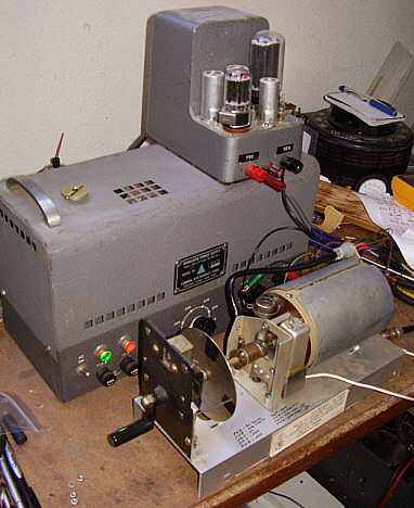 photo right: A test fixture for working on the PTO out of the receiver. The voltages required are +195vdc, +150vdc and 6.3vac. The turns counter makes it easy to keep track of the ten turn span of the PTO range. The turns counter can help keep track as you progress on reducing end-point error but it isn't accurate enough for < 1kc EPE. The disk and pointer are for extreme accuracy (< 1kc EPE.) The disk has a fine wire pointer and is marked off in one quarter turn divisions. Note that the PTO on the fixture is actually from a R-725 receiver since the PTO has a ferrous metal shield installed. Also, the R-725 PTO requires a jump from pin C to ground to apply filament voltage to the VFO tube.
