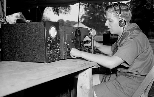 The AR-60 can be operated on batteries although it requires accessing the terminal boards in the power supply section of the receiver to move some wires and add the battery cable. An access hole for the battery cable is located next to the AC input socket. Once battery operation is set-up the receiver cannot be operated on AC unless the wiring is changed back. Some AR-60 receivers were equipped with an Output Limiter circuit. The five step OL control is mounted just to the left of the tuning dials. Output Limiters were used to allow headset listening to a signal at a desired level and to prevent the audio from being driven higher by static discharges or other noise pulses. The Output Limiter generally saved the radio operator's hearing and also helped reduce "listener fatigue." Some AR-60 versions will also be found with a pilot lamp (with green jewel) installed to the left of the tuning dials. Prior to a pilot lamp installation there wasn't a visual indication that the receiver was powered up. All pilot lamps appear to be "end user" installations but all are almost identical which implies that instructions or kits were available from RCA. The AR-60 was available as a black finished table model (suffix T), as a rack mounted unit with full dust cover (suffix R) or in a deluxe two-tone gray table cabinet (suffix S.) It appears that late in production the rack mount receivers (and the table versions) were available with gray painted panels. Note the header photo showing a Boy Scout posing with an AR-60-T version in gray with OL control and pilot lamp. Also, late in production some AR-60 receivers may have come equipped with later octal tube equivalents of the normally used large six and seven pin tubes, e.g., 6K7 for 6D6, etc. |