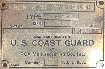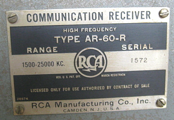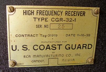 CGR-32-1 - U.S. Coast Guard AR-60R - KØDAS Shown to the right is the CGR-32-1 that was restored by KN4R. It now belongs to Ron KØDAS. The CGR-32-1 was missing it's original data plate so the actual serial number of the receiver is not known. The data plate installed is an accurate reproduction that is virtually identical to the original data plate except that the serial number used was an arbitrarily chosen - "26"- to correspond with the receiver's probable manufacture date.