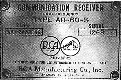 Early AR-60 receivers went into RCA facilities like some of their Coastal Stations. The U.S. Coast Guard was also equipped some of their Cutters with AR-60 (CGR-32-1 and CGR-32-2) receivers. Pan American Airlines used some AR-60 receiver in their direction finders. Since the final selling price was so high, very few AR-60 receivers were built. Less than 300 is the commonly accepted limited production quantity built during the period 1935 up to 1940. However, based on serial number reported that estimate might be low. If serial numbers for Coast Guard receivers indicate actual quantity by starting at 1 and ending at some higher number upon the same contract then over 300 receivers were produced just for the Coast Guard. Adding the Signal Corps and commercial users accounts for probably around 150 receivers and perhaps 50 others produced for various end users. This would total about 500 receivers produced but this is just based on reported serial numbers so the actual quantity produced could be more, perhaps a lot more. RCA built the AR-60 receivers "to order." This could be one receiver for a single order or perhaps several receivers for a commercial or military contract. One thing is obvious, the AR-60 was never a "production" receiver, it was never built on an assembly line with production run quantities in the hundreds of receivers. It seems likely that the largest quantity of the AR-60 receivers went to the U.S. Coast Guard with perhaps as many as 300 receivers built on at least three contracts between 1935 and 1940. The second largest quantity probably went to various commercial users, including RCA installations, with this accounting for probably another 50 to 100 receivers. The U.S. Army Signal Corps also ordered AR-60-G receivers and this quantity was probably around 30 to 100 receivers (three were needed for each triple diversity set-up.) This leaves the amateur market but it seems unlikely that anymore than 50 to 100 AR-60s would have made it to the hams. This totals between 380 up to 600 receivers built between 1935 and 1940 with the greatest number going to the Coast Guard.