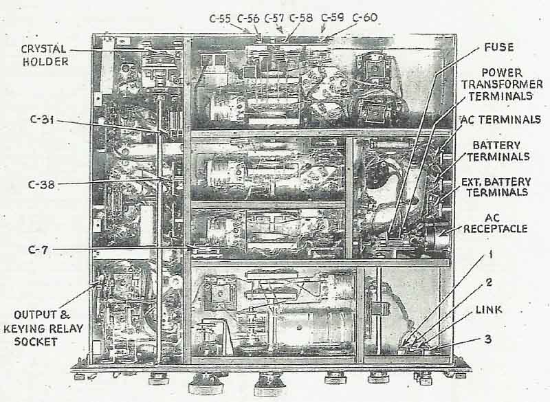One look under the AR-60 chassis and you can tell that the receiver couldn't have been built on a production schedule. These receivers literally had to be "built to order" with all construction being accomplished "by hand." In the photograph to the right, which is of the CGR-32-1 version of the AR-60, the receiver is oriented on its side with the antenna input terminals to the lower left. Starting at the lower left, this is the antenna input terminal board location. Note the thumbscrews that allow moving a link to select either balanced or unbalanced antenna inputs. Just visible in this section is the shaft that is the variable coupling control which carries the two antenna coils. Note the cut-out in the side of the chassis in this section - on all types of the AR-60 receivers other than the CGR-32-1 this area is an access cut out for the three side-mounted antenna jacks. Just above the antenna input section is the antenna coils and antenna trimmer section. Note that the two antenna coils are mounted with a silk-insulated copper screen between them and the coupling coils. This copper screen prevents electrical coupling but allows magnetic coupling. This tends to keep the input impedance constant and results in lower noise inputs. The Antenna Trim condenser is driven with two fiber pulleys. Also note the drive for the Band Spread tuning uses a cast mount for the rear of the shaft. Behind the antenna coils/trimmer section is the 2nd RF Amplifer section. Note the two trimmer capacitors. The upper one is C7 and the lower one facing down is C9. The Mixer section is next and note the trimmer facing down. This is C16. Behind the Mixer is the Local Oscillator section. The section that is bottom center contains the AC power input, power transformer wiring and filter wiring. Usually the fuse holder is mounted in this section but on some receivers it will be found on top of the chassis for easier access. The accessory socket behind the power supply section is an end-user addition to provide battery operation and remote standby of the receiver. The top section far right is the Crystal Filter assembly. The crystal is actually mounted inside the ceramic base of the Phasing condenser. The crystal is secured with a screw mounted metal plate on the back side of the condenser mount. Just visible above and behind the Crystal Filter shaft are two of the adjustments for the IF transformers. The audio section is to the left with the two phone jacks. The audio output is also accessible from a socket and a terminal board from the side of the chassis (note the cut-outs for the socket and terminals on the side of the chassis.) Note that all capacitors are either Faradon square-open types or wax-potted paper caps mounted in metal housings. All adjustment trimmer capacitors are air-variables. When the bottom covers are installed each section if fully shielded. Note too that the chassis is NOT steel but is nickel-plated brass as are the three separate bottom covers. |