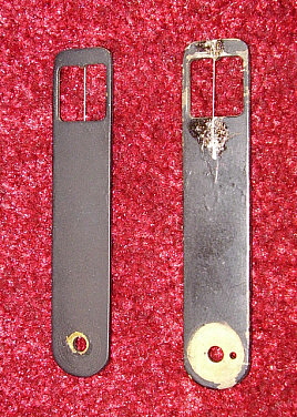 To remove the pointers, first unscrew the pointer mounting screw. The pointer has a locating pin so it can only mount to the hub one way. If you have to remove the band spread pointer then remove the main tuning dial. It's mounted with three screws that are threaded into the panel and utilize spacers to maintain the correct clearance between the main dial and the band spread dial. Now you have access to the band spread pointer which is mounted to its hub the same way the main dial pointer was mounted to its hub. Turn the pointer over and you'll notice that the index wire is held in place with a small amount of solder. The wire actually mounts in an incise and is secured with solder. If your index wire has come lose all that is required is to place the lose end back in the incise and apply a small amount of solder. After the solder is set up, file the solder as flat as possible and then paint the area with black paint. If the index wire is missing, use very fine tinned copper wire, like a single strand from a piece of 22 or 24 gauge stranded wire. This is usually about the right size but compare to a good index wire if you have one. The wire should be silver in color. Your incises can be cut by using an Exacto knife. Since it's solder, it will be easy to cut out the old solder and have the incises open. Now lay the new wire into the incises and hold with the Exacto knife blade while flowing the solder across the incise. Once one end is secure pull the wire tight and lay it into the other incise and solder it in place. Using a file, remove as much solder as possible to get the back of the pointer flat. Paint the soldered area black Install pointers and the main dial and check to make sure the new solder doesn't rub the dials. In the photo to the right, the repaired index wire is on the right. It hasn't been painted (yet) to show what the repair looks like. |