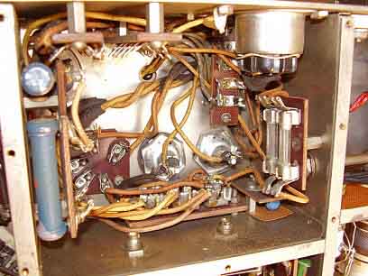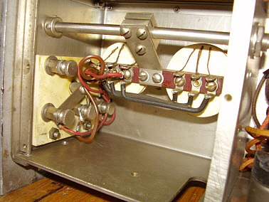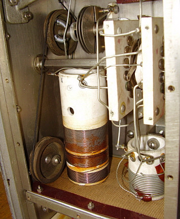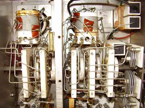 how much signal level was going to be needed for low-noise reception. All of the RF coils were wound on ceramic forms, however all of the front-end coils are tapped for the six tuning ranges (rather than using separate coils for each range.) The tuning condenser is a massive unit that was built by Hammarlund Mfg. Co. Inc. for RCA. The cast bronze frame allows for mounting both the main tuning condenser and the bandspread condenser. The audio output is from the single 41 tube that uses a 600 Z ohm output transformer. |