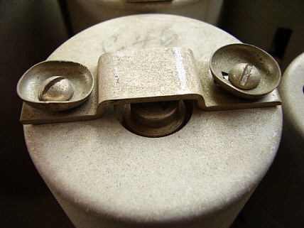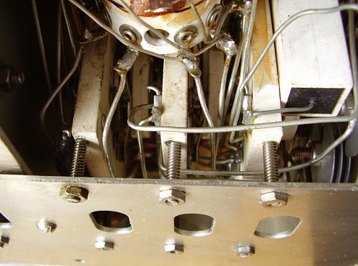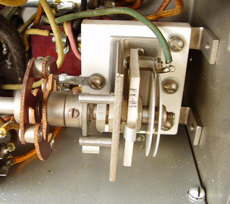 of the switch. The adjustments consist of 6-32 threaded rods that are slotted on one end. These thread into the center bottom cover and are secured after adjustment with a 6-32 locking nut. The proper adjustment is approximately .005" clearance between the stop (the end of the threaded rod) and the edge of the ceramic stator. The procedure is to loosen all of the adjustment screw nuts. Then, one by one, adjust each screw until it just touches the ceramic stator and then just slightly back out the screw leaving approximately .005" clearance. Then tighten the lock nut and proceed to the next adjustment screw until all 16 adjustments have been made. Cycle the bandswitch through its positions and then recheck the settings. If your AR-60 is missing the bottom covers or is missing the center cover with the adjustment screws then a replacement bottom should be made and installed. The replacement must have the 6-32 threaded rods so the bottom cover has to be thick enough to allow for tapped holes. The original cover was .060" brass that was nickel-plated. If you don't have the bottom center cover then repeated use of the band switch without this cover installed will eventually cause mis-alignment of the switch stator which will cause intermittent operation on some bands. It's also possible that long-term use with the bottom plate not installed could cause breakage of the solder joints due to movement of the switch stators and relative stiffness of the buss wiring. |