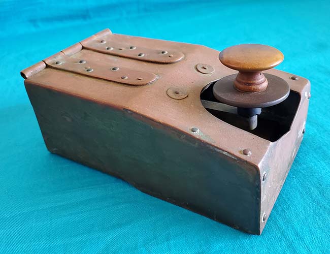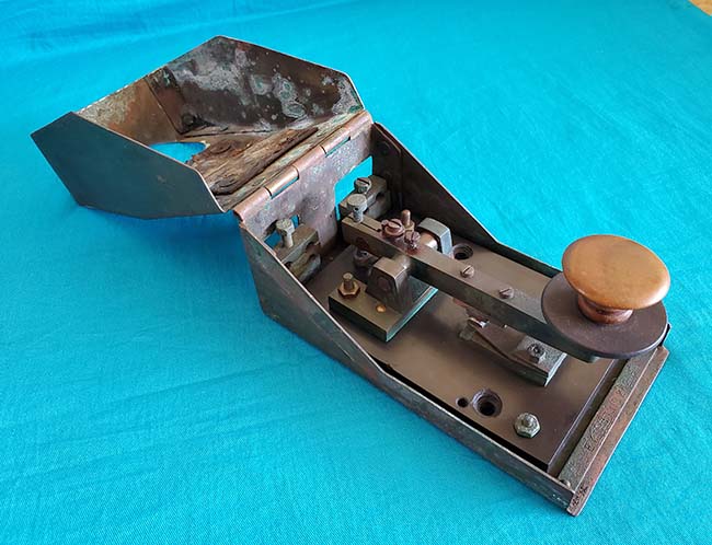 WWI British Marine Spark Key "KEY PATT. NO. 2426" The builder of this spark key is unknown but it's likely that it's British and its unique patina makes its end user's location pretty obvious. The use of the brass box almost entirely enclosing the key was common with early shipboard spark transmitter operation. The box provided protection for the radio operator from the high voltage and high current that was present on the key when used with the large, direct keyed spark transmitters installed on ships at that time. Internally, the key mechanism is very similar to the L. S. Brach J-6 but mounted on a much larger, hard rubber base. The spring tension adjustment is identical to the Brach key. This spark key has dual contacts in that one large set is located at the front of the lever while another smaller set is located at the rear of the lever. This provided the user with a set of normally-closed in receive that opened when the key was pressed down. Of course, the front contacts operated as normally-open in receive and closed to transmit. The cabling to connect the key exits from the rear of the box where large cable clamps are located to secure the wiring. "KEY PATT NO. 2426" is stamped on the tag riveted to the inside of the box just in front of the key base. When in use, the key was probably screwed to the operator's table (countersunk holes in base go thru the box.) To examine or adjust the key would require lifting the hinged top cover. Under the inside of the lid is a multi-layered section of mica for preventing contact between the lid-box and the high voltage key contacts. Also the key base is mounted to the box on several layers of mica sheets. Only the key knob protrudes out of the opening in the lid which allowed safe operation of the key. The former owner of this key, W7SK, told me he found it in Bulgaria.