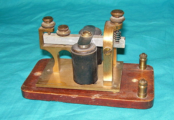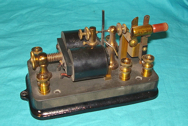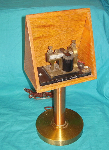 J.H. Bunnell Company 4 ohm Sounder It's likely that several million sounders were built over the years from the mid-1800s up to the mid-1900s. Every railroad station had to have several. Sometimes the local telegraph office was at the local post office. Other times there was a specific "telegraph office" in the town. Then there were the many other users that included inter-office communications (pre-telephone) in large buildings or building complexes. These local users had the 4 ohm sounders. These were just about the lowest DC resistance available and allowed for very short distances on direct two-wire operation using a couple of dry cell batteries as the voltage source. Low resistance sounders were usually used on NO (normally open) circuits that wouldn't deplete the dry cell batteries as quickly. Some of the 4 ohm sounders were for instructional devices since this was about as "local" as one could get. Patent date on this Bunnell sounder is May 7, 1895 but it probably dates from much later. |