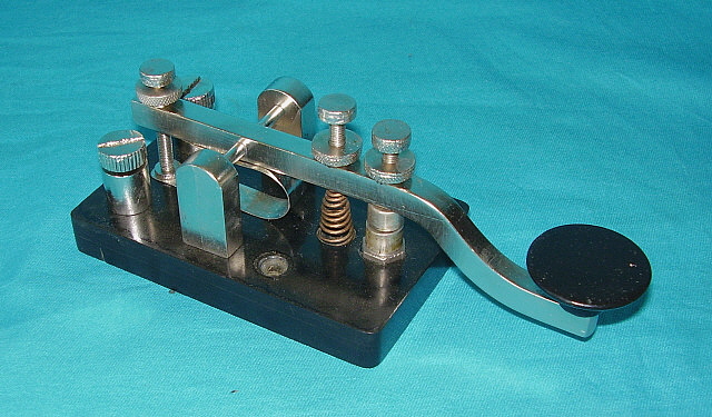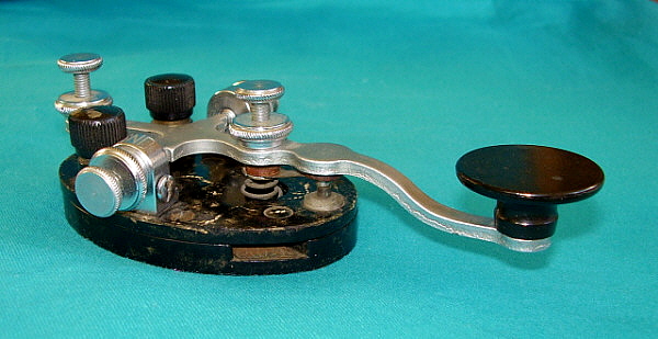 Straight Keys The typical key used by ham operators and sometimes even professionals. Though Hand Key is the name generally applied to these types of telegraph keys, hams usually refer to this type of key as a "Straight Key." Most hams learned the code using a straight key and after they had built up their speed switched over to a semi-automatic key (a bug.) Many hams stayed with the straight key because of its simplicity and accuracy - something that took a lot of practice with a bug (or later using an electronic keyer.) The straight key shown to the left is a late-production E. F. Johnson Speed-X "Navy Style" hand key. The contacts are 1/8" diameter which is typical for a "radio key." These straight keys were available for many years (note the other Navy Style keys in the photo below not to mention the Signal Heavy Duty Wireless hand keys above.) This particular Johnson Speed-X hand key is the type that I used when first learning the code and while I was a Novice ham. The key always had a good "feel" to it and the Navy knob makes sending very easy. |