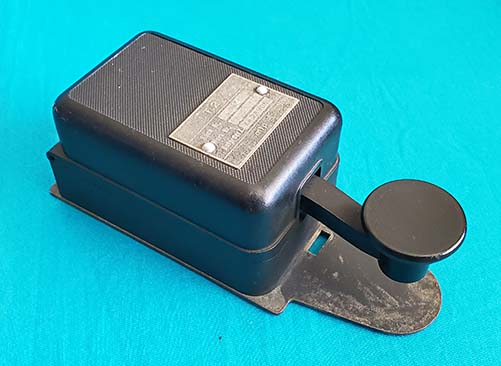 German Military T.2 Hand Key Lorenz This German hand key probably dates to just before WWII. Most of these types of keys were built by Lorenz although there may have been other builders. The key has a metal base with a non-skid rubber pad with a diamond type of pattern on the bottom of the base. The metal base may have slid into a specific holder mounted to the sending table. The bakelite body is very dark brown and the top cover flips-up. Inside are the key adjustments and access to the connection terminals that are on the right side of the key. There's a molded socket in the lower body (on the left side) that accepts a two blade contact. This was to ensure that the key was disconnected if the cover was up and to also make sure that to send with the key required the cover to be in the down position covering the contacts. This example is missing the cable that mounts to the right side of the key. |