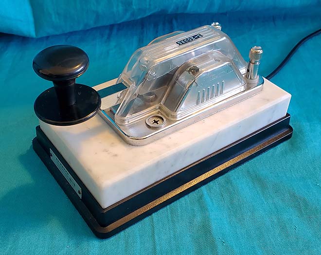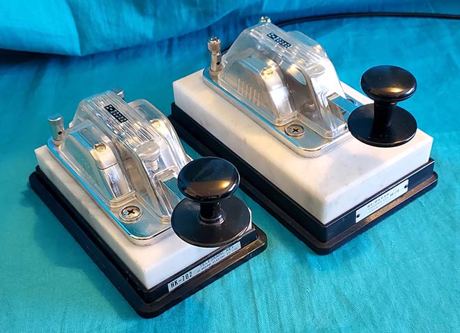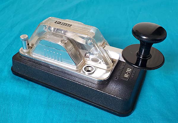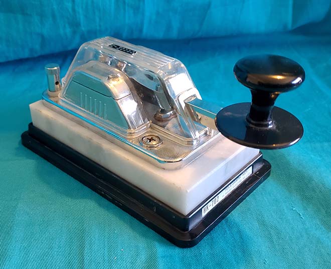 ![]() photo above: The HK-703 is a version without the marble top. This places the key knob somewhat lower to the table top. The two screws (or screw holes) that are each side of the lever are for mounting the key to a table top or desk. These screws aren't necessary for mounting the key to the base. When not used for mounting to a table top, screws and nuts can be installed to fill the holes and provide additional mountings for the key to base. The HK-703 has been replaced by the HK-704. |