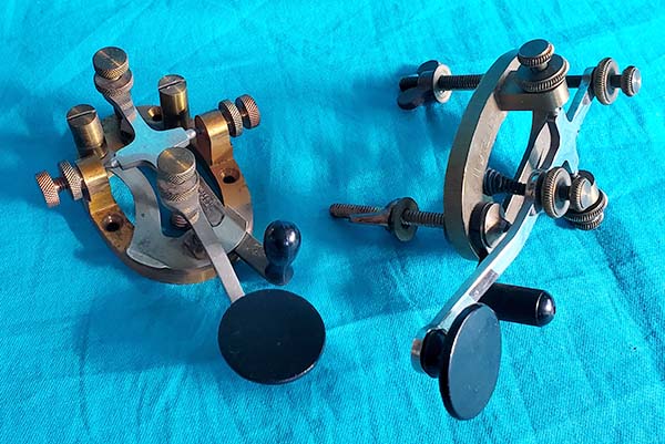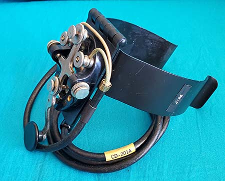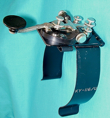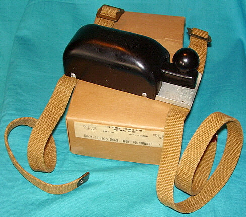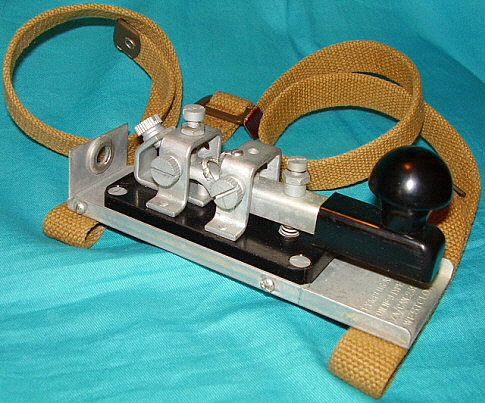 - Winslow Electronics - Contractor, The keys shown are a different type of "Leg Key" - one that actually clamps to your leg and allows you to send CW without the benefit of a table. These keys would have been used by the military and were necessary for portable operation in the field where that operation might be from a Jeep or other type of vehicle. Generally, these "Leg Keys" were provided if it was necessary to use CW. The U.S. Army's primary mode of communications was usually Voice however, CW provided better communications accuracy in poor conditions such as heavy static or weak signals, so the option to run CW was always available. These types of keys were in use from WWII up through the 1970s (and probably later.) In fact, the J-45 (right) was in its original box with wrappings and is dated 9/79. The KY-116/U was built by Winslow Electronics and uses a standard J-37 key mounted on a hinged base with leg clamps. The J-45 is identical but the contractor is not known. Both types of keys have the hinged base that allows the key to be turned upright to set on a desk, if available. The keys are shown in the "down" position for mounting on the operator's leg. Actually, operating the key in this manner is pretty comfortable and good CW can be sent with the key clamped to your leg. The method was not for long-term operation and was intended for portable use where a table or desk wasn't practical. |